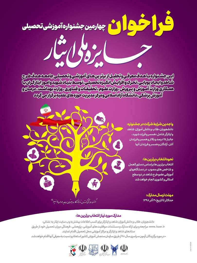، چهارمین جشنواره آموزشی، تحصیلی جایزه ملی ایثار با هدف معرفی و تجلیل از برترینهای آموزشی و تحصیلی جامعه هدف طرح شاهد و ایجاد پویایی، تحرک و افزایش انگیزه تحصیلی با مشارکت دستگاههای آموزشی عضو طرح شاهد شامل وزارتخانههای بهداشت، درمان و آموزش پزشکی، علوم، تحقیقات و فناوری، آموزشوپرورش، دانشگاه آزاد اسلامی و مرکز مدیریت حوزههای علمیه در اسفند ماه سال جاری برگزار خواهد شد.