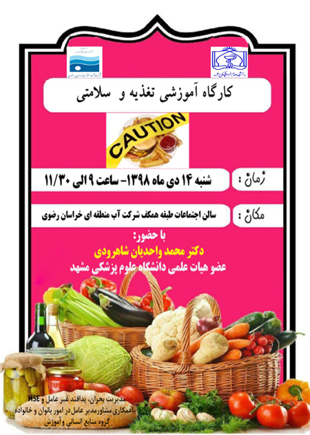 کارگاه آموزشی تغذیه و سلامتی با هدف ارتقاء سواد سلامت همکاران نسبت به تغذیه و مولفه های سلامت در روز شنبه مورخ 14/10/1398 در سالن اجتماعات شرکت آب منطقه ای خراسان رضوی برگزار گردید.