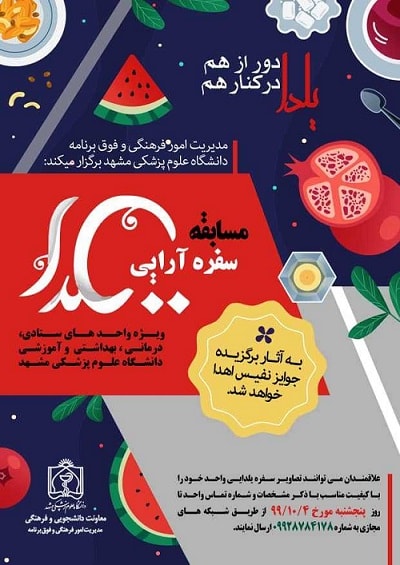 فراخوان مسابقه عکس سفره آرایی یلدا با عنوان «دور از هم، در کنار هم» و با هدف رعایت پویش درخانه بمانیم به همت مدیریت امور فرهنگی وفوق برنامه دانشگاه علوم پزشکی مشهد منتشر شد.