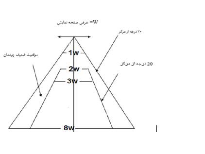 یکی از اصول ارگونومی در منزل ومحیط های آموزشی فاصله بین صفحه نمایشگر وفرد می باشد . درمنزل فاصله مناسب بین افراد و صفحه تلویزیون می باشد. صفحه تلویزیون علاوه بر تشعشعات مضر به دلیل تعداد نوسانات جریان برق برای سلامتی از اهمیت برخوردار است. پیشنهاد داده شده است با توجه به عرض صفحه تلویزیون بهترین منطقع نشستن در مقابل صفحه در زاویه 20 درجه از مرکز صفحه تلویزیون سمت چپ و20 درجه سمت راست و حداکثر در 30 درجه با فاصله 3 تا 8برابر عرض صفحه می باشد یعنی اگر تلویزیون 32 اینچ استفاده می نماییم عرض صفحه نمایش 70 سانتیمتر می باشد . فاصله پیشنهادی از 2متر تا 6 متر مناسب تر است. یعنی اگر کسی قالی 3*4 استفاده می نماید و تلویزیونش در یک طرف قالی قرار گرفته است، محل پیشنهادی برای نشستن کودکان از وسط گل قالی به بعد و در محدوده 60 سانتیمتر دو طرف مرکز تلویزیون خواهد بود (شکل 51). بنابر این چیدمان مبل ها و زاویه قرار گرفتن تلویزیون در منازل از اهمیت بالایی برخوردار است .
