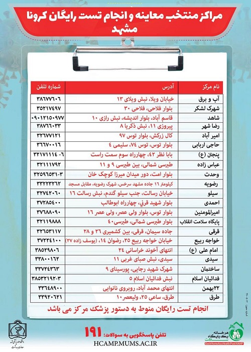 22 مرکز منتخب معاینه و انجام تست کرونا در مشهد فعال و آماده خدمات رسانی است
