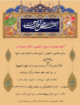 برگزاری طرح گروهی ذکر صلوات به همراه عبارت (وعجل فرجهم ) ویژه کارکنان و دانشجویان ، در روز عید سعید مبعث به نیت سلامتی و تعجیل در فرج امام عصر (عج)